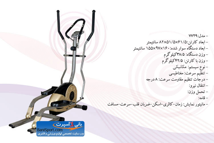 اسکی فضایی 7729 : - مانیتور نمایش : زمان – کالری – اسکن – ضربان قلب – سرعت – مسافت |