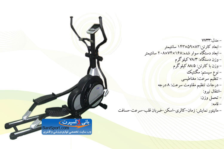 اسکی فضایی 7733 : - مانیتور نمایش : زمان – کالری – اسکن – ضربان قلب – سرعت – مسافت |